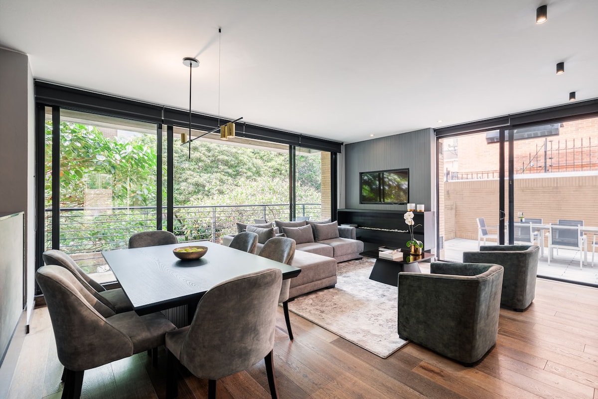 Live Bogota in this Luxury, new hotel-style ! This 2 Bedroom+ 2 Bathrooms+1 sofaBed+ private Jacuzzi Spa with 65” tv in the spa + epson laser projector CINEMA! centrally located in the prime area Chico , short walk from restaurants and shops. Located within 1 mile to park 93, this 5*Hotel-Style Suite brings you to live Bogota the right way, work or play, decoration a unique design luxury apartment, great vibe with a 190sqft private terrace! Just for you! Fiber Wi-Fi and 1 parking are included.
