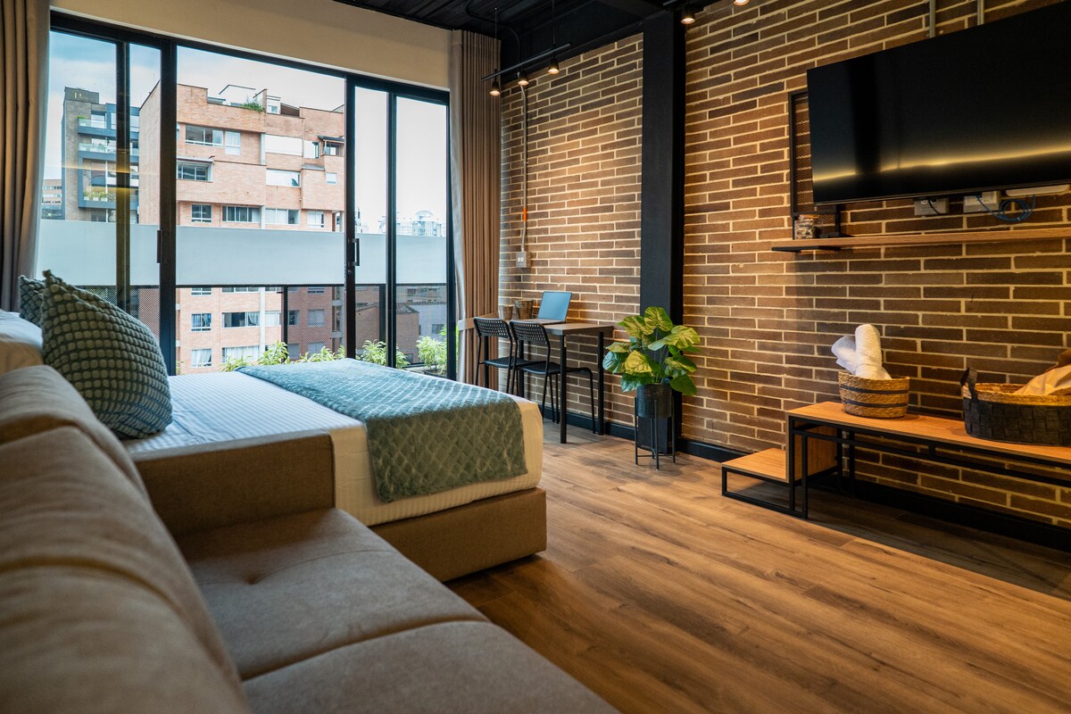3450 Living is easy to spot among the trees in Laureles. Designed like the bow of a ship, the angular combination of glass, brick, black metal, and concrete is conveniently located. The relaxed atmosphere is perfect for young professionals, students, couples, digital nomads, or friends looking for a cost-effective space in a prime location. Four floors of modern-chic apartments feature expansive valley views from the balconies, residents also have access to the rooftop social area with jacuzzi.