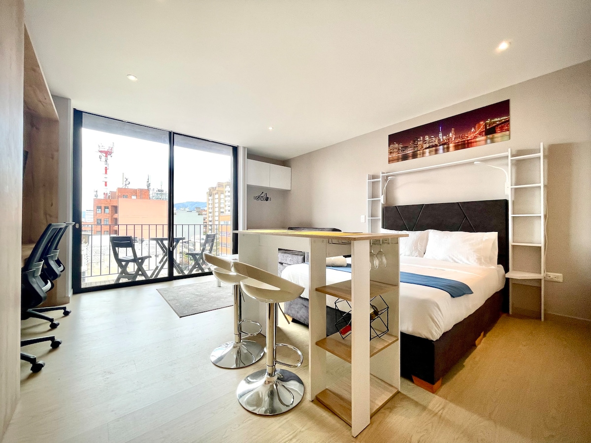 A pasos de Andino/Retiro/Atlantis, en Muttuo. WiFi rápido + escritorio cómodo para trabajar +estación de café, balcón, vista panorámica cerros orientales. Cama doble colchón ergonómico con blackout para descansar. Recepción 24/7 y llegada sencilla. Edificio nuevo con zona de coworking, terraza vista panorámica a la ciudad y zona BBQ.