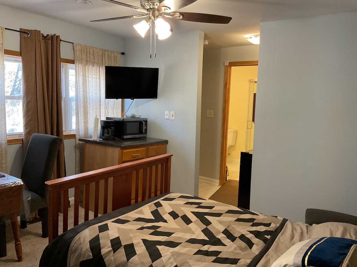 Unwind in this cozy, modern-rustic suite less than 20 minutes from the airport and perfect for traveling professionals or couples. This stylish private space blends mid-century charm with mancave vibes and features a private entrance, bar and seating area, refrigerator, microwave, and a spacious walk-in shower. A dedicated laundry room adds convenience for longer stays. Enjoy comfort, privacy, and easy access to the city in this quiet retreat.