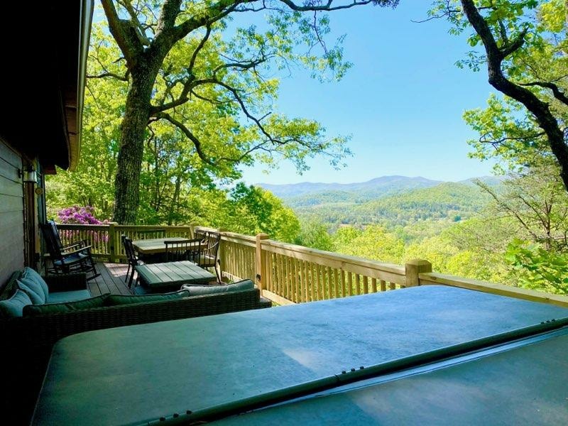 Breathtaking year round mountain view cabin with a private setting in the mountain side. 2 bedrooms w/ a great open floor plan with a wood burning fireplace plus a large loft area with 2 beds . Cabin has a large screened porch w/adjoining open deck to enjoy the stunning views while relaxing in the hot tub. You can also enjoy nearby hiking, tubing, fishing, Lake Nottley, Lake Chatuge or stroll around Helen or Blue Ridge. The options and views are endless. UCSTR License # 028724