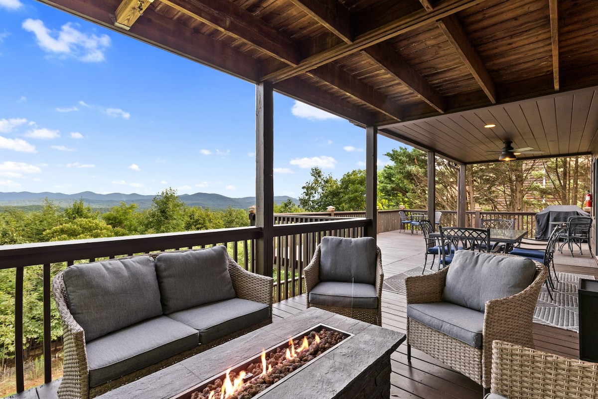 Retreat to the mountains and step into Cascading View Lodge where you will be greeted with incredible long-range mountain views. This luxury cabin is <20 min from downtown Blue Ridge. Come take in the mountain views on our screened in porch and spacious deck. We offer a fire pit underneath the stars and hot tub to enjoy with family and friends! For your comfort we offer 5 smart TVs, high speed WiFi, game room with arcade game and more, and a fully stocked kitchen! Let us help you plan your trip!