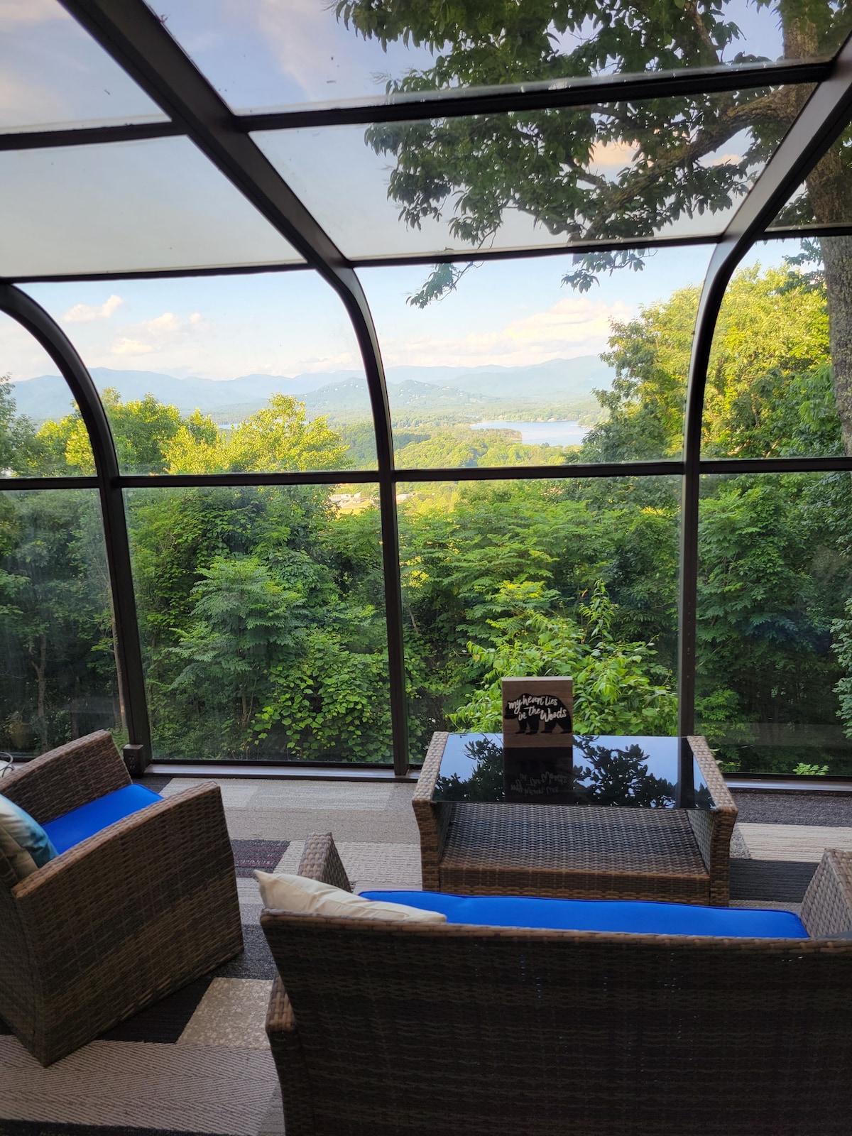 2 Bedroom Cabin with beautiful sunrise views of Lake Chatuge and sunset views from the front porch. The Cabin is centrally located to various outdoor activities from hiking, boating and horseback riding. Come relax and unwind on top of a mountain. Many relaxing amenities including hot tub, pool table with bar area, 70 inch TV, indoor electric and gas fireplaces, outdoor propane firepit with 3 decks and a solorium to enjoy the views. the basement is one large room with walkout to hot tub/firepit