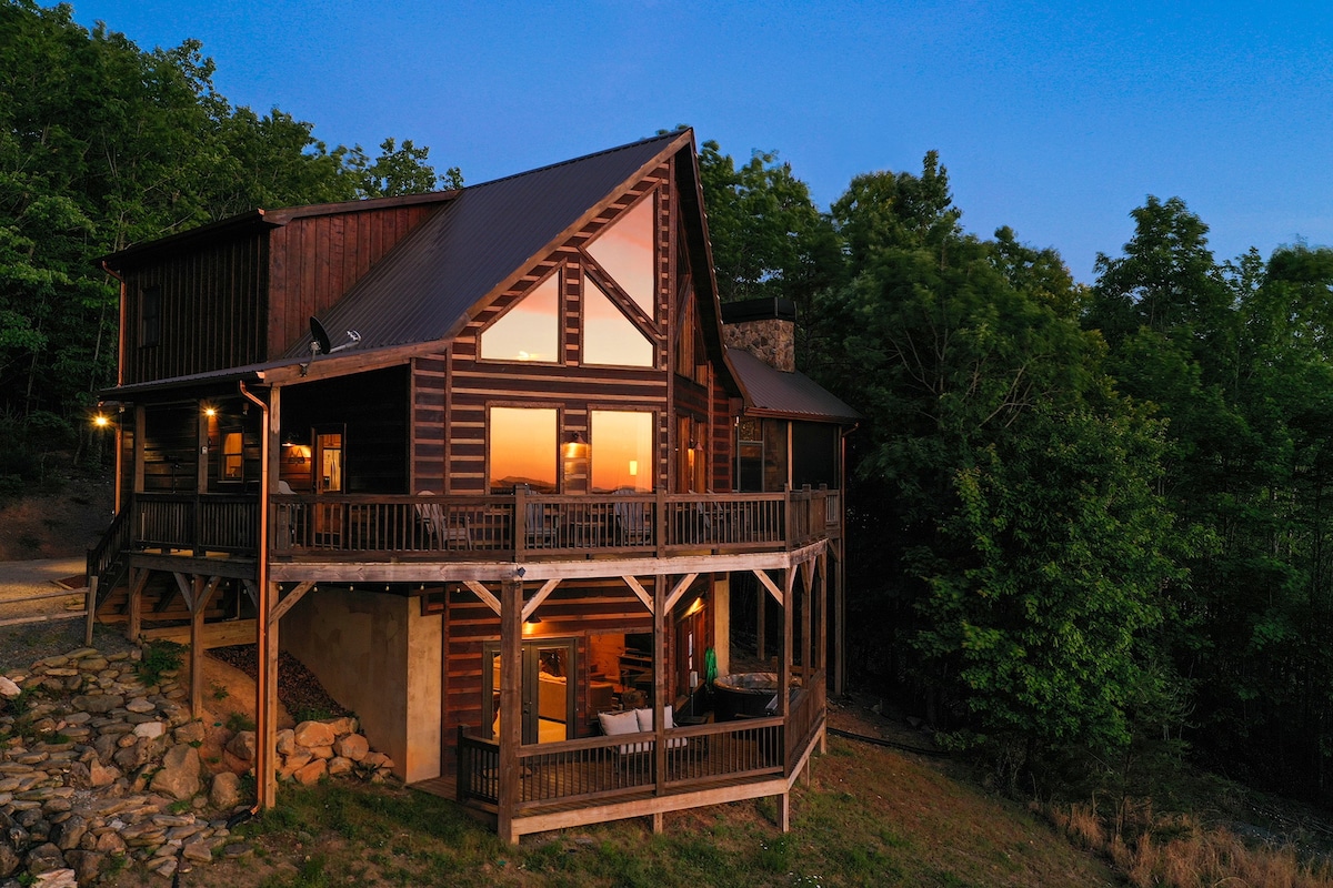 Retreat to the mountains and step into Cascading View Lodge where you will be greeted with incredible long-range mountain views. This luxury cabin is <20 min from downtown Blue Ridge. Come take in the mountain views on our screened in porch and spacious deck. We offer a fire pit underneath the stars and hot tub to enjoy with family and friends! For your comfort we offer 5 smart TVs, high speed WiFi, game room with arcade game and more, and a fully stocked kitchen! Let us help you plan your trip!