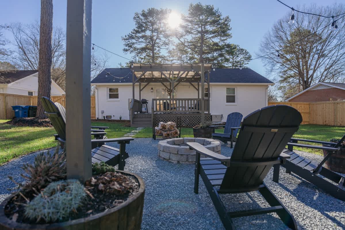 Escape to a stylishly remodeled mid-century single-story home on a private, wooded lot in Charlotte. This 3-bedroom retreat comfortably fits 6 guests and features a modern kitchen, and multiple outdoor spaces including a deck, patio, and fire pit. You're just a 7-minute drive from Uptown Charlotte and blocks from the vibrant Plaza-Midwood Social District, offering the perfect blend of peaceful seclusion and city convenience. Ideal for families and groups seeking a chic and central getaway.