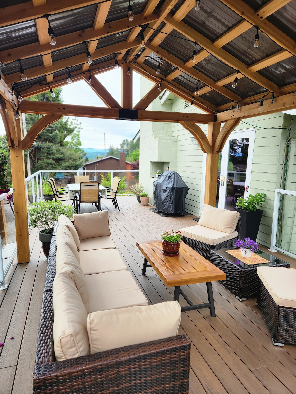 We invite you to come the lovely City of Sammamish near Bellevue and Redmond. It is a safe and quiet neighborhood. Enter to a large living area with a wall of windows backing up to a hidden forest. This property offers two primary bedrooms. Plenty of space for entertaining both inside and out. Downstairs has fun game room. Lots of privacy. We have video doorbell called The Ring - we only monitor the outdoors with this security camera. RV parking available upon request.