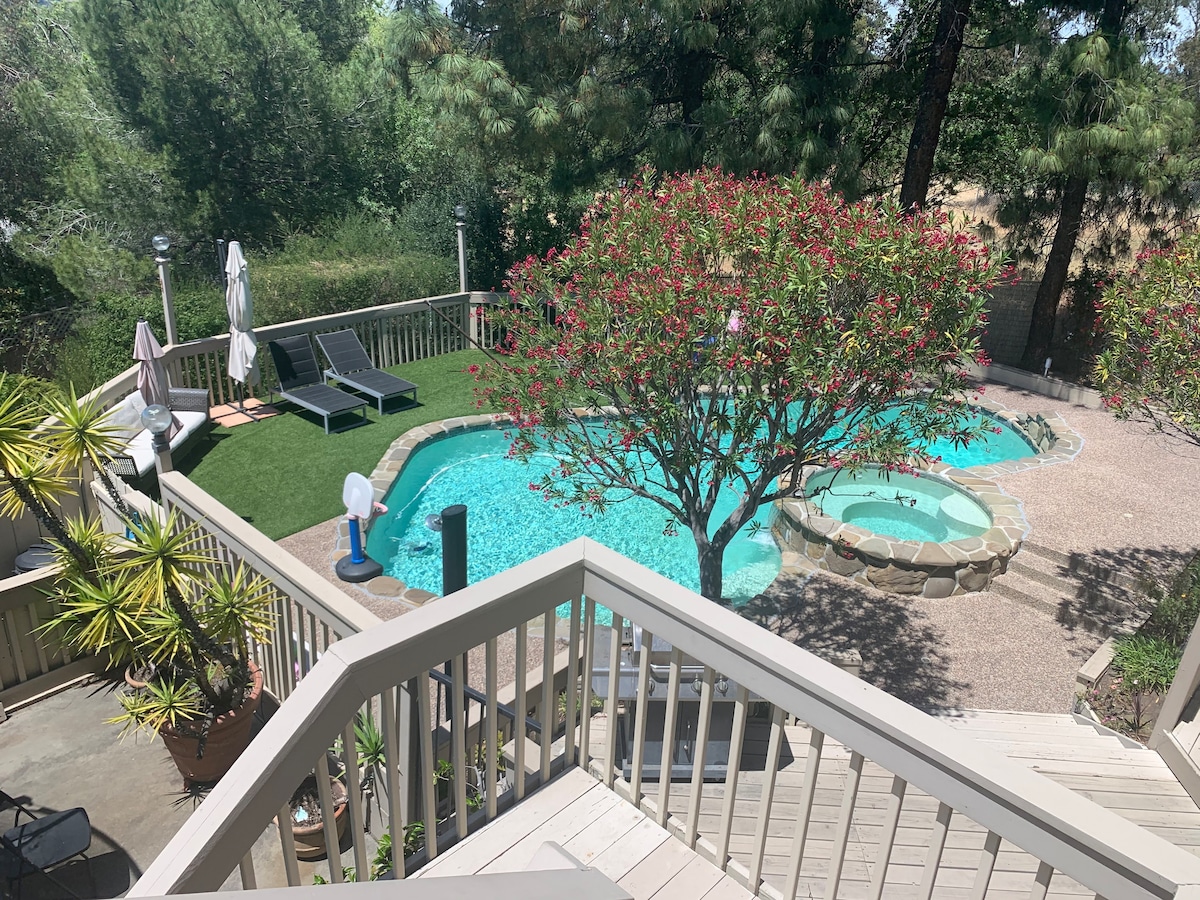How about a rejuvenating get-away with pool and hot tub? Relax on a patio lounger overlooking a tropical garden. Enjoy an evening snack while watching a movie. Super comfy bed and separate living room. Deep cleaned. 2 separate units off same foyer; but no shared walls. Private locked unit door. Shared access to spa/pool (9am-11pm) for overnight guests only. 27 stairs to reach house. Host lives upstairs. Complimentary beverage for 3+ nights. After 10 stays, $100 credit.