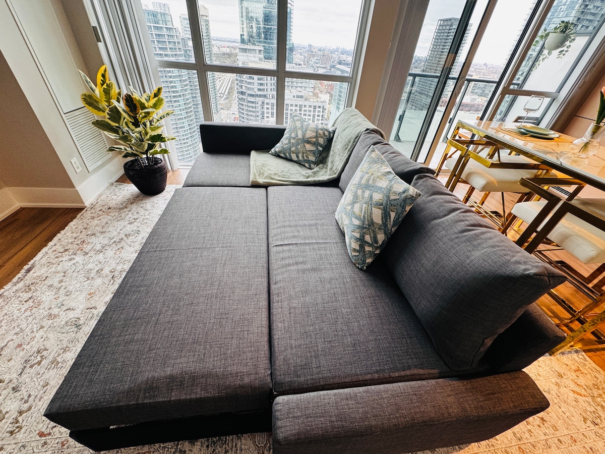 Stay in the heart of downtown Toronto in this modern one-bedroom condo just steps from the CN Tower, Rogers Centre, and the waterfront. The unit features a comfortable queen bed in the bedroom and a sofa bed in the living room, perfect for couples or small groups. Enjoy skyline views through floor-to-ceiling windows or relax on the private balcony. The condo includes a full kitchen, smart TV, high-speed Wi-Fi, and in-suite washer and dryer. Guests also have access to a gym and outdoor pool .