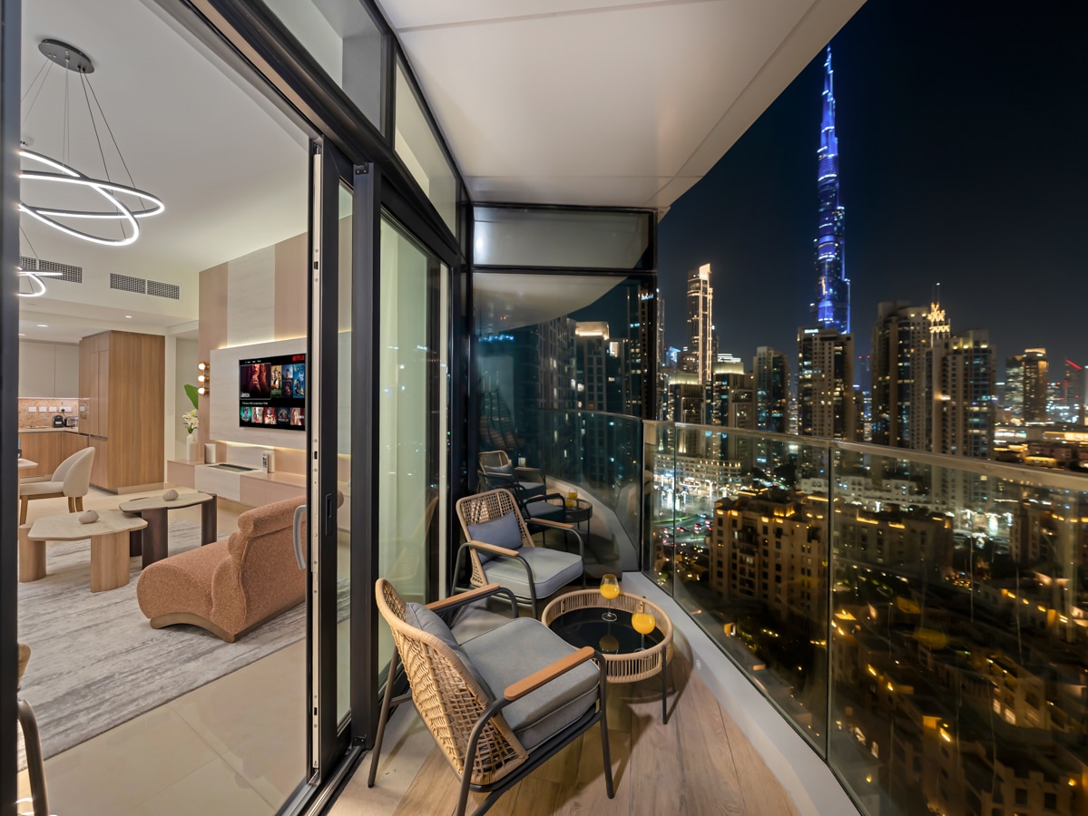 Experience luxury at our exclusive, fully serviced apartment nestled within a 5-star hotel. Enjoy the breathtaking views of the iconic Burj Khalifa from the largest and highest Downtown infinity pool on the 64th floor, maintain your fitness regime in our gym with panoramic city views, and immerse yourself in our stylish apartment with stunning Burj Khalifa views from our balcony as well as from every room in a prime location—just a 15-minute walk from the Burj Khalifa and Dubai Mall.