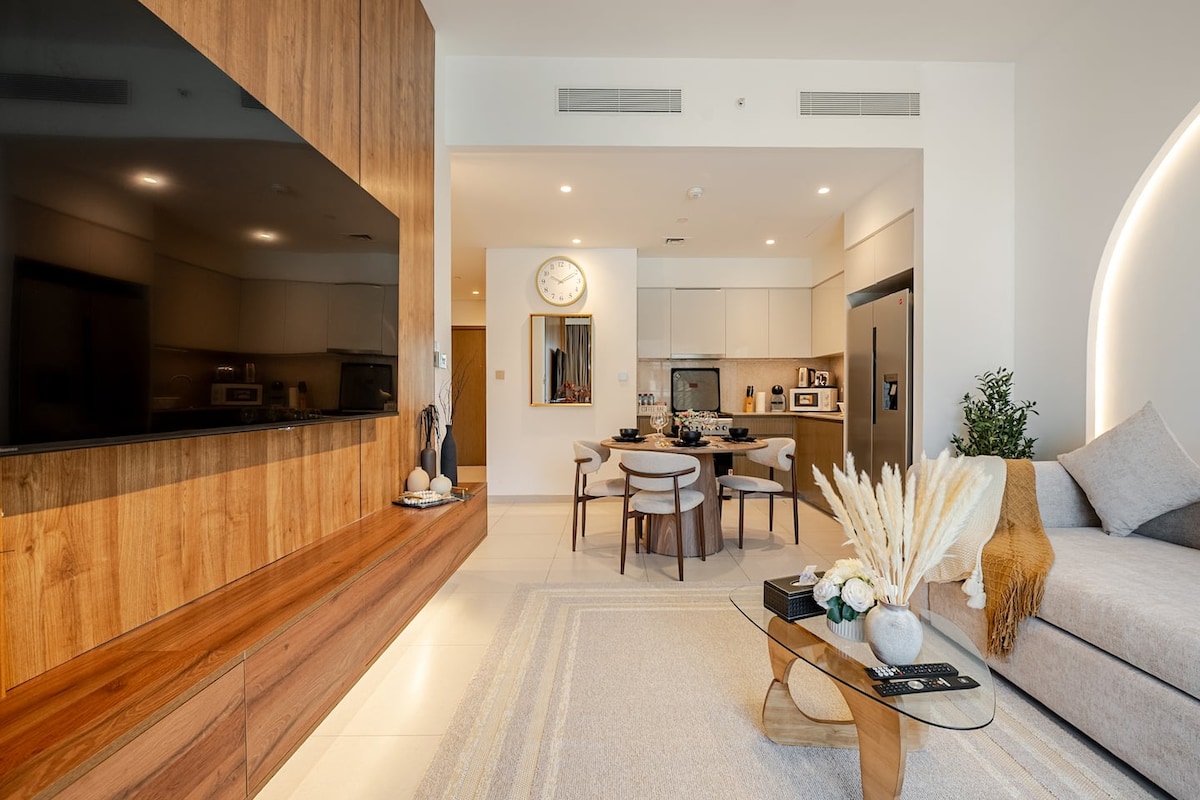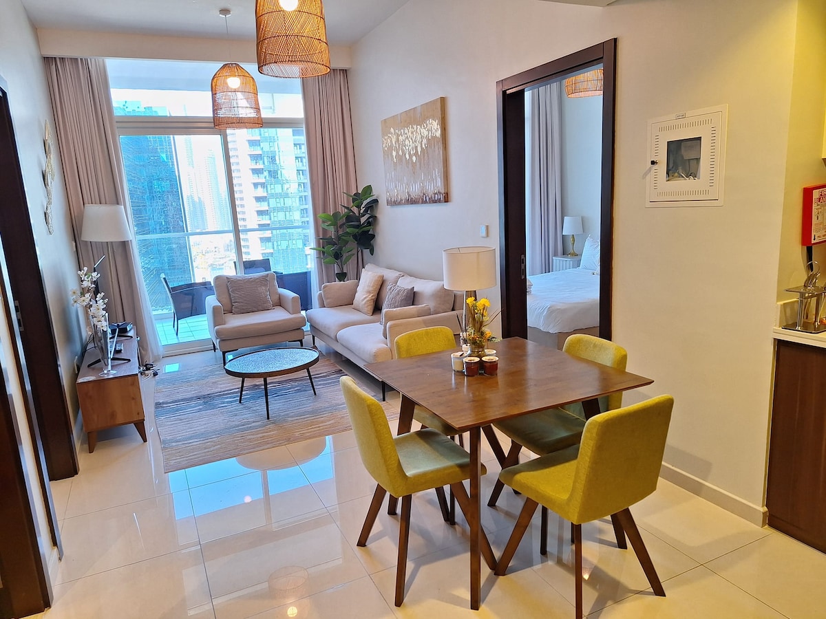 Discover a unique stay in our brand-new 1BR apartment in a New Tower by EMAAR, featuring imperfectly wabi sabi theme. Enjoy breath taking views of the Burj Khalifa and Dubai Mall from the private observation deck, just a 3-minute walk away. Revel in exclusive access to a private observation deck with jaw-dropping vistas of the Dubai Fountains and Burj Khalifa. Unbeatable Location, this luxurious retreat combines comfort, stunning views, and unbeatable convenience.