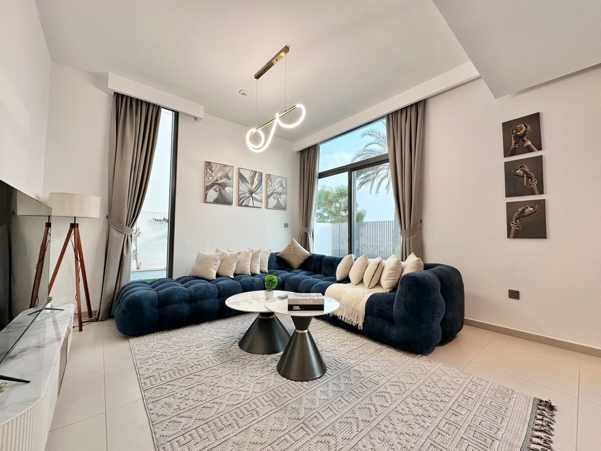 Step into a spacious, stylish home where comfort meets elegance. The villa features a cozy living room with a smart TV (guests may log in with their own Amazon, Disney, OSN, or personal accounts), a large dining table for six, a fully equipped kitchen with all appliances, cookware, and a double-door fridge, along with a washing machine, dryer, and dishwasher.