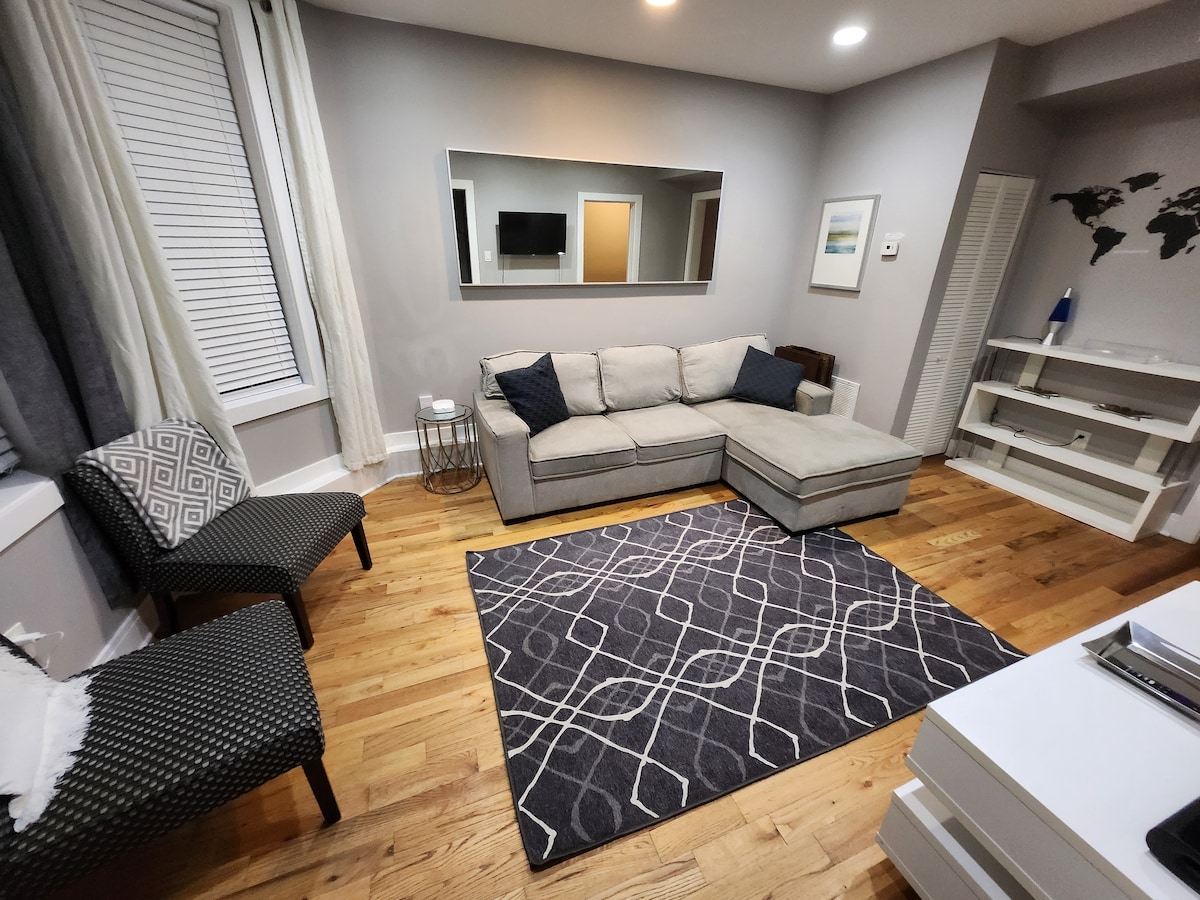 Welcome to your home away from home in the heart of one of Chicago's safest and quietest neighborhoods! This beautifully updated 1 bedroom apartment offers everything you need for a comfortable and convenient stay. It is perfect for couples, solo travelers, and business visitors. Book now for a truly unforgettable experience in the Windy City! - 1 free parking spot - 400 MB Wifi - 2 smart T.V. with access to Netflix, Hulu, Amazon and more! - Desk - Easy app paid laundry in the building.