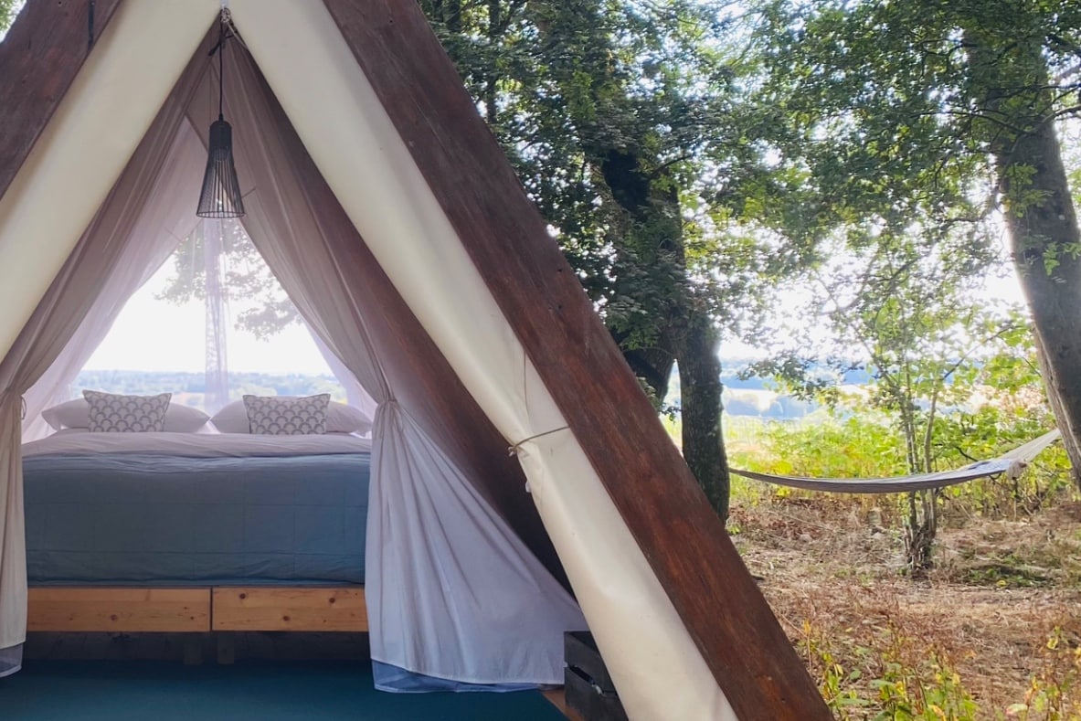 Our rustic Glamping Treehouse stands 5m above the ground, which is accessible via an exciting seven-meter long suspension bridge. Boasting a warm themed interior, the Treehouse offers breathtaking views over the Chess Valley, which can be seen from the balcony and through the large panoramic window. Features include a spacious king-size double bed, en-suite toilet and basin facility. The outdoor balcony is home to a shower and hot tub, the perfect spot to relax amongst the surrounding treetops!