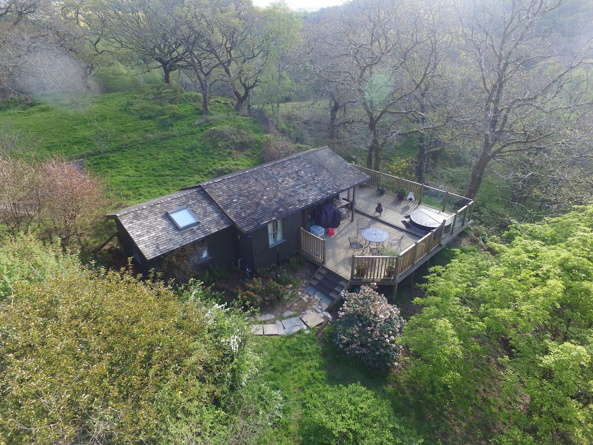 Our secluded cabin is surrounded by ancient oak tree forest and all the wildlife that comes with it. It’s so peaceful that you will only hear the river and the birds. Set in 10 acres of our own land for you to explore and easy access to Snowdonia public foothpaths, it’s perfect for those looking to spend some time in nature. The cabin itself features private wood fired hot tub, wet room, underfloor heating, large deck with bbq, kingsize bed, kitchen, living and dining area and a private cinema.