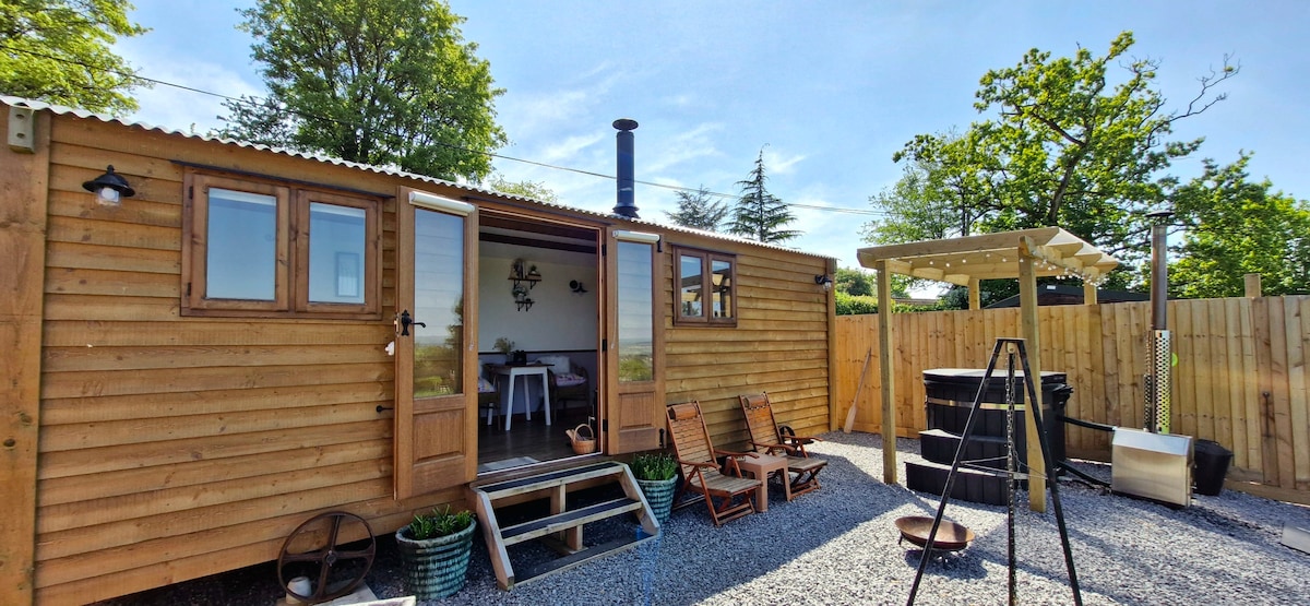 You'll love this unique and romantic glamping escape. Nestled between the Wye Valley and Welsh Mountains. Your own piece of tranquillity overlooking the Skirrid, the Sugar Loaf & Black Mountains. A Tiny house, featured on BBC2's My Unique BnB, with mezzanine double bed, sink, comfy chairs and wood burning stove. Separate flushing loo, shower and kitchen. Outdoor bath, fire pit with BBQ.Located at Ty Gwyn Cider so a pint just a short stroll away. Magnificent views. 1 night stay £150