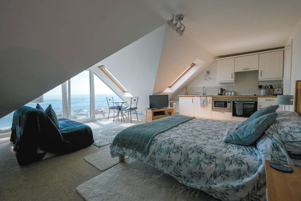 One of the best sea views on the Cornish holiday letting market. Free on street parking 150 meters from property. Parking at property in summer school holidays. Stunning studio loft apartment just 200 metres from the sea and beach. Wake up to the view of the sea from the end of the bed. Self check in, 100% self contained, self catering with kitchen. Private separate access to apartment from Top Road. High spec finish within. Ultra-fast Wifi, SKYTV/Sports/Cinema/Netflix/Prime/Disney+/Discovery+