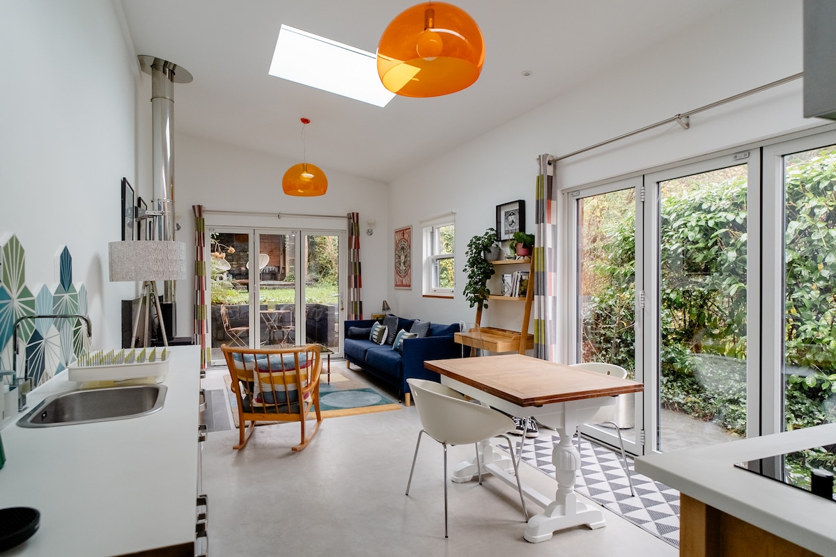 Open bedroom doors to a leafy, decked garden to chat in hanging rattan egg chairs. Fresh, clean-lined, contemporary styling includes transparent dining chairs and a marble bathroom. The family-friendly home is in a graceful redbrick period townhouse.