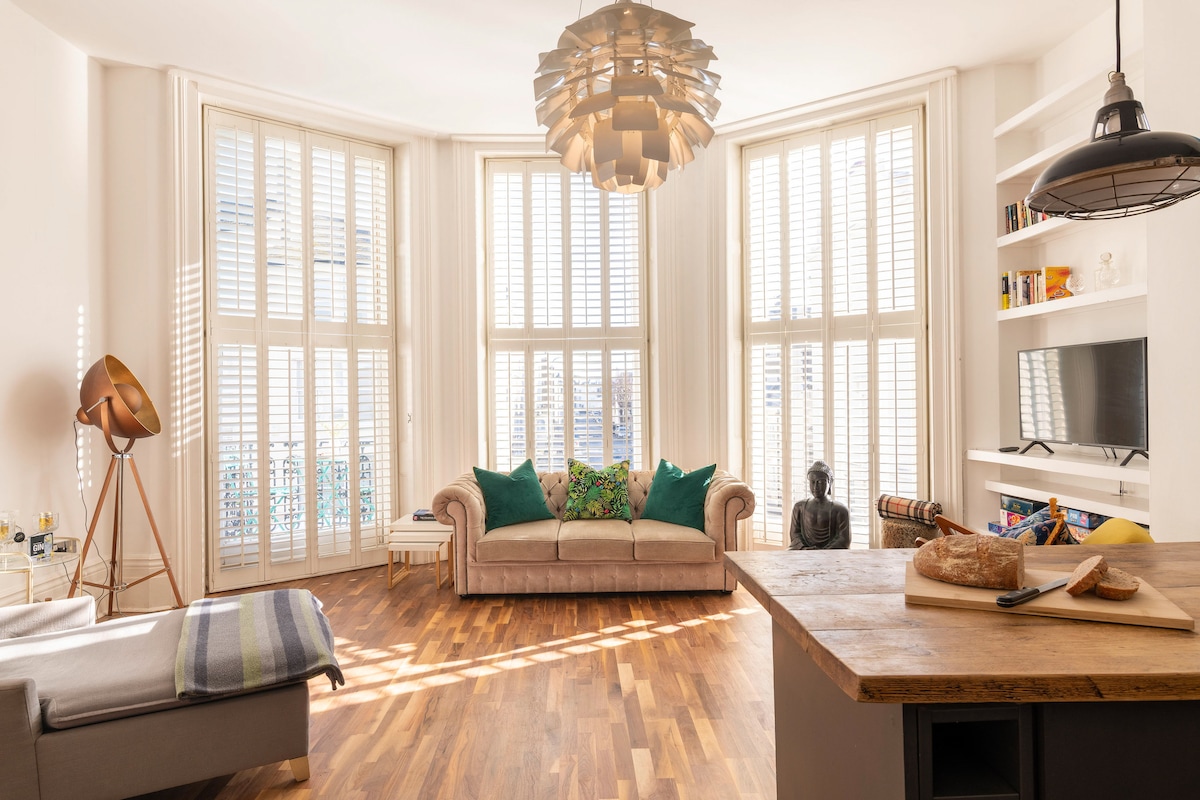 Beautiful 11-foot high ceilings in a home that blends spacious rooms with a pop-art aesthetic. Lounge on the chesterfield sofa while watching Netflix, enjoy a coffee on the bijou balcony with a sea view. This property is in a grade II listed residential old school building.