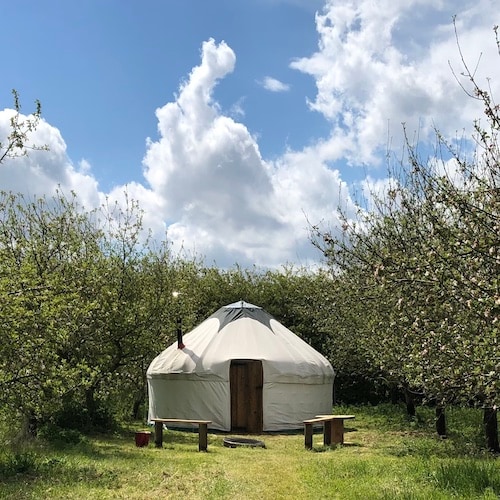 Our small eco-campsite in our organic apple orchard, a quiet break for families and couples close to Cambridge and Ely. 4 grass pitches for camping & 4 glamping options – a yurt, tipi and 2 bell tents dotted amongst the apple trees. Our organic farm is a haven for wildlife. Explore our 117 acres of meadows, woodland and orchards, see our horses, cows and hens. Try our delicious apple juice, cider, beef & sausages. Family friendly, exclusive use available for group bookings. Campfires encouraged