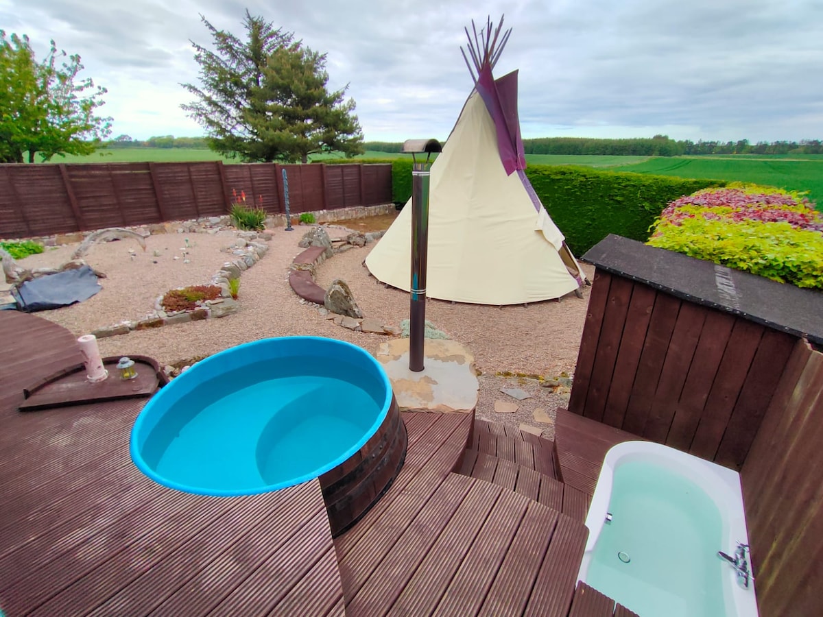 Exclusive hosted tipi retreat in Moray’s whisky country at the end of a quiet farm track, surrounded by fields and northern skies. Ideal for small groups who value shared space and firelight. Includes a wood-heated whisky barrel hot tub (on request), cold plunge tub, outdoor kitchen and fire area. The retreat is entirely yours. A simple outdoor compost toilet is 5 metres from the tipi. A full bathroom is in the cottage (30 metres). Host lives on site and respects your privacy.