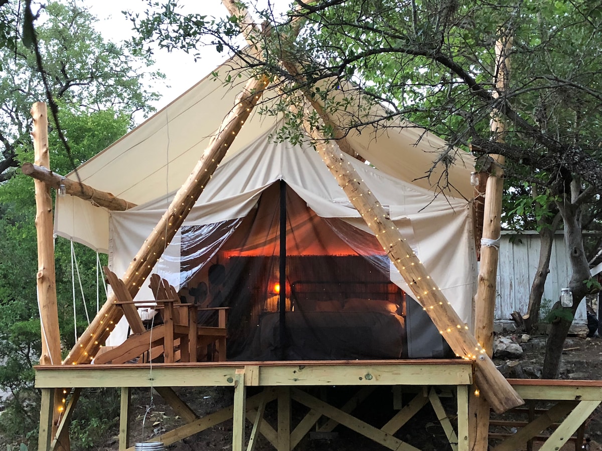 Suspended 10 feet in the air, Pecan Haven is luxury glamping at its best, our tent includes a king size bed, A/C, indoor bathroom with walk-in shower, private hot tub, coffee, wifi, and more. Relax outdoors, take a nap in your hammock chairs, indulge in a soak in your private hot tub, or avail yourself of the private outdoor shower. This Treehouse also has a smart TV for your Netflix and movie binge nights. This treehouse has everything you'll need for a fun, relaxing stay in the hill country.