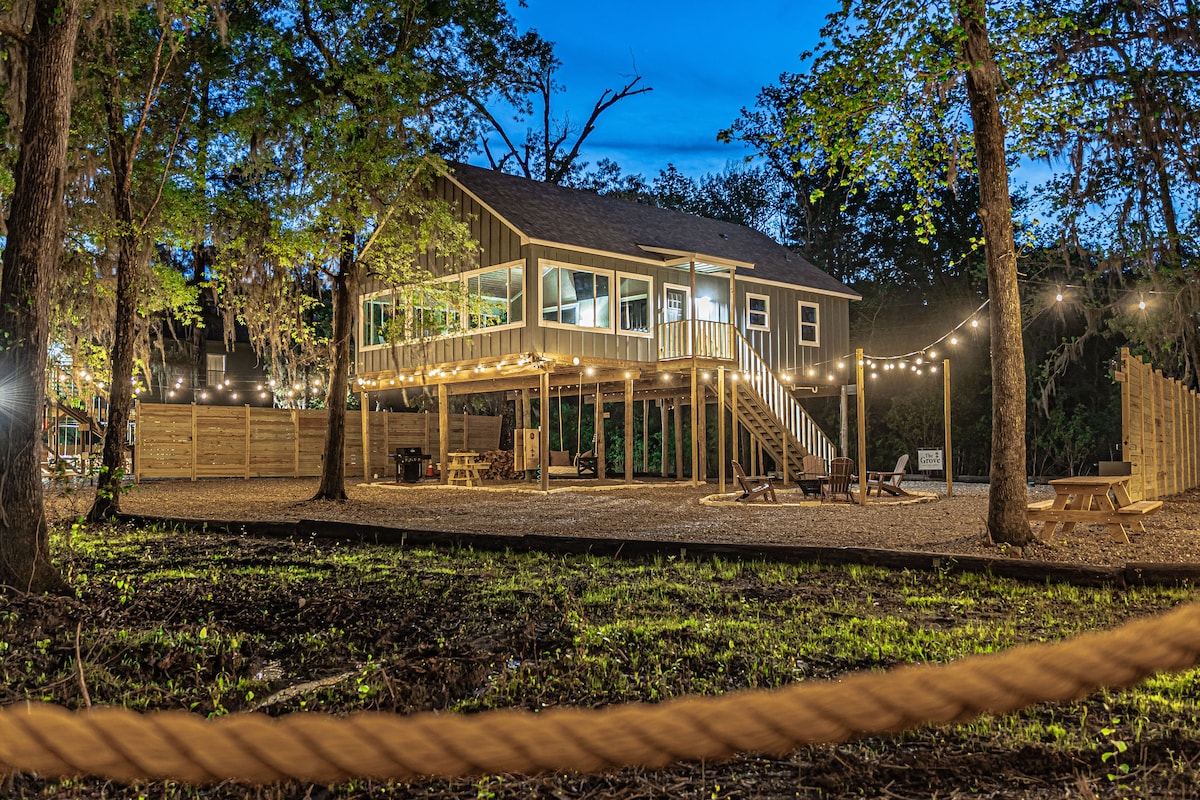 Perched on 20 acres along Catfish Creek, this enchanting tree house allows you to appreciate nature from a birds eye view. Whether it’s kayaking, canoeing, or exploring along the creek; relaxing in the hammocks and swings; engaging in a board game; or roasting marshmallows at the fire pit, Amenities include a full kitchen with full bath, outdoor shower, booth seating in dining table for up to 8, 2 bunk beds and loft style sleeping.