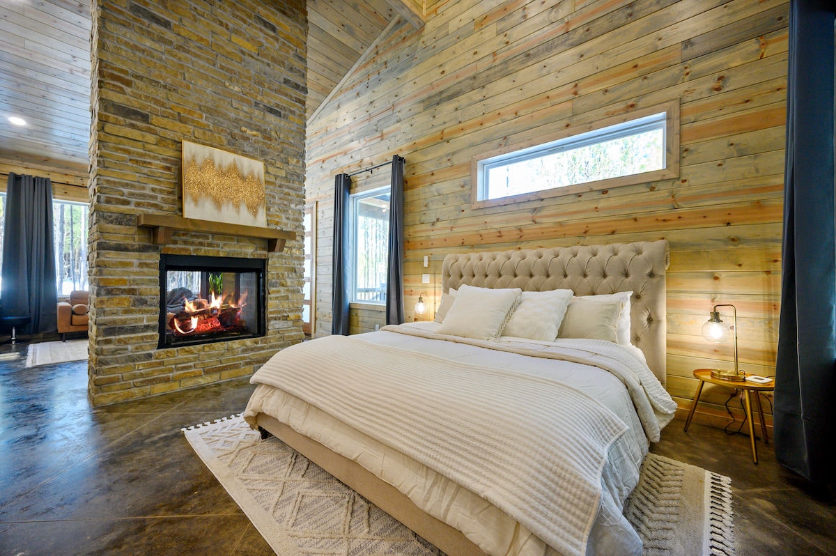 Designed by local architect, Cyrus Sutherland, our home is truly one of a kind. With its intricate stonework on the outside, natural wood accents on the inside, custom built-in furniture and floor-to-ceiling windows throughout, Magruder is sure to leave a lasting impression. When you're here, you'll have access to all of our luxury amenities, including an open-concept living space, fully-stocked gourmet kitchen, Master suite , King size bed, and private outdoor patio with a hot tub.