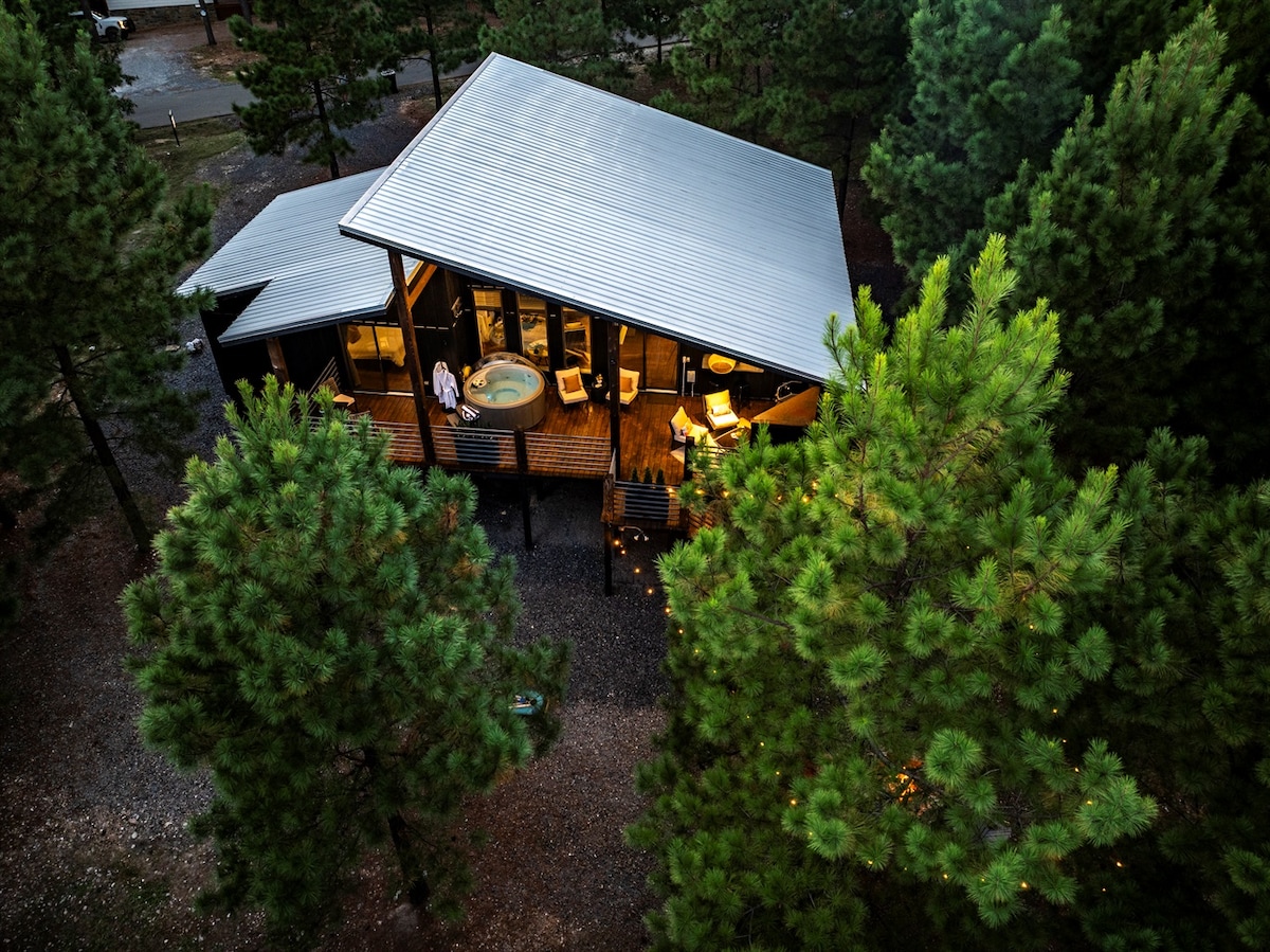 “Luxury is not about things — it’s about moments that slow time.” A modern, luxury cabin perched among the pines and reached by fully paved roads in the heart of Hochatown. Enjoy a private hot tub, indoor and outdoor fireplaces, and tall windows framing peaceful forest views. Designed for couples seeking romance and relaxation, yet close to Broken Bow Lake, Beavers Bend trails, wineries, breweries, and dining. A quiet retreat where comfort, style, and nature come together.