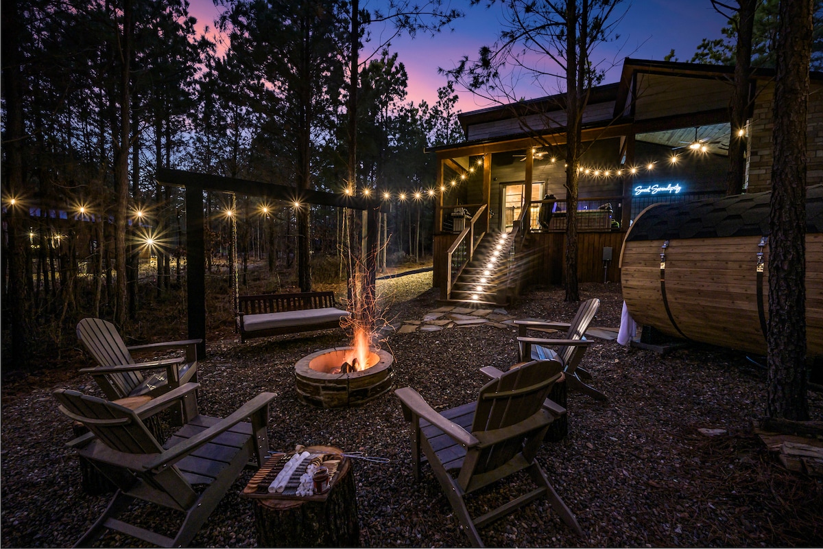 Welcome to Sweet Serendipity – A Romantic Woodland Retreat Luxury Amenities: 🧖Barrel Sauna w/Accessories 🔥Firepit w/Large Daybed Swing & Chairs ♨️Private Back Deck w/Sectional, Jacuzzi, & Outdoor Fireplace ☕Fully Stocked Coffee Bar 🥇Cornhole Set with Complimentary Koozies 💪Exercise Equipment: Lululemon Yoga Mats & Blocks, 2 Adjustable 25lb Dumbbells, Resistance Bands, Weighted Jump Rope & Foam Roller 🏞️Outdoor Equipment: Hiking Rods, Fishing Rods & Accessories