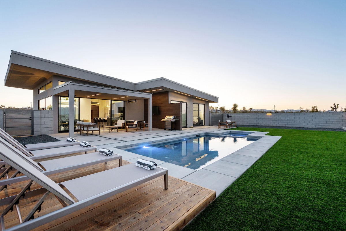 Immerse yourself in this newly built luxurious 3 bedroom, 2 Bath home, featuring expansive windows that unveil the breathtaking landscapes, a sparkling heated pool and spa for starlit dips, and a dedicated fitness space. Unwind under endless skies on 2 sprawling acres in your own private oasis, perfect for stargazing and patio gatherings. Wake up to breathtaking sunrises, explore Joshua Tree's otherworldly wonders, then return for a rejuvenating soak in your desert haven.