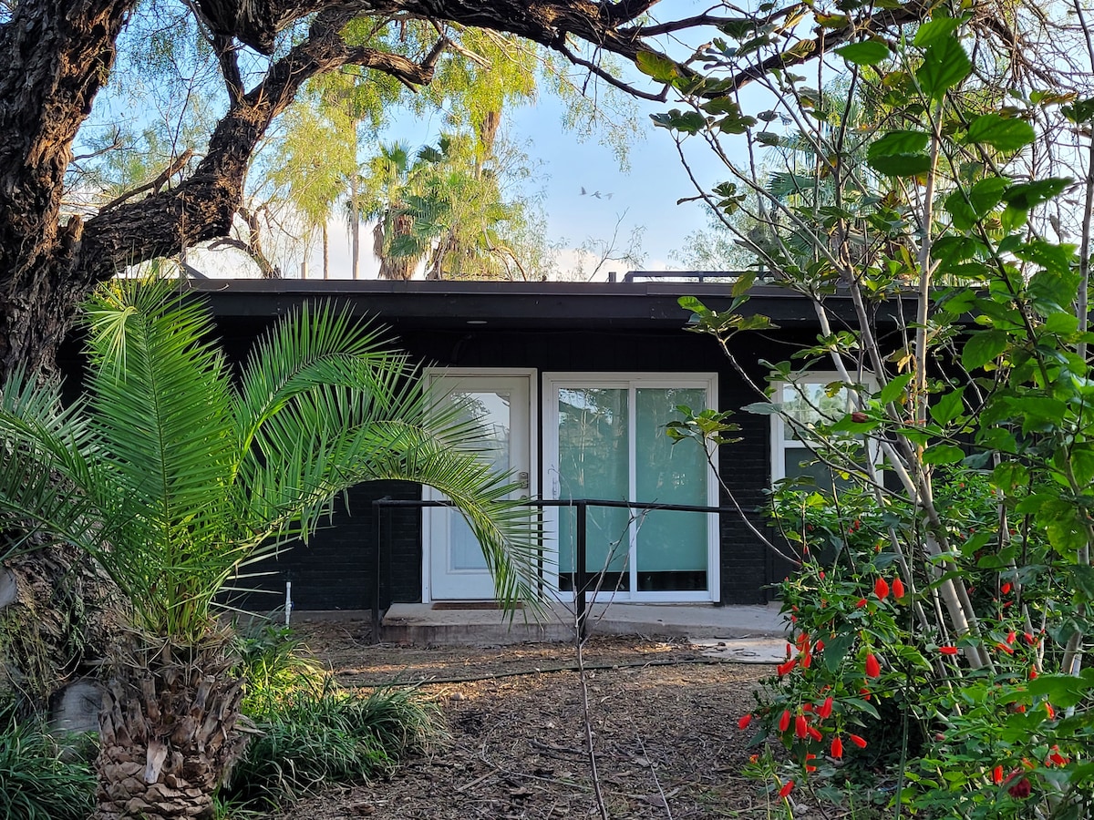 The Cactus Wren is one of the 5 rooms at Spin & Margie's Desert Hideaway, a quiet retreat on 29 Palms Highway, less than 5 minutes from the center of Joshua Tree. This room is the most secluded, being set slightly apart from the other 4 courtyard rooms, but it is still just a few steps away from the shared courtyard area. It has a private bathroom with tub/shower, its own private sitting area, and like all our rooms it has access to our pool, and ample free parking.