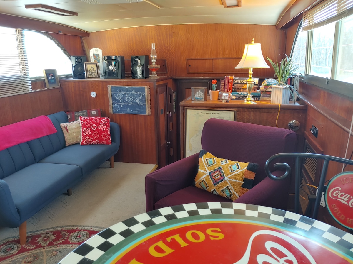 The "Cookie B" is easily accessible from our adjacent parking lot via our newly lighted stairs and ramp and her position in the marina offers maximum indoor and outdoor privacy. Her bow deck is huge so catch some rays by day and star gaze by night. Then enjoy morning coffee on a covered aft deck. And the view!!!The "Cookie B" enjoys one of the most beautiful, unobstructed and unique sights to be found at any place along the James River.