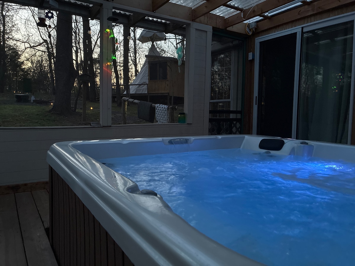 宁静的森林浪漫露营地,带热水浴缸,池塘