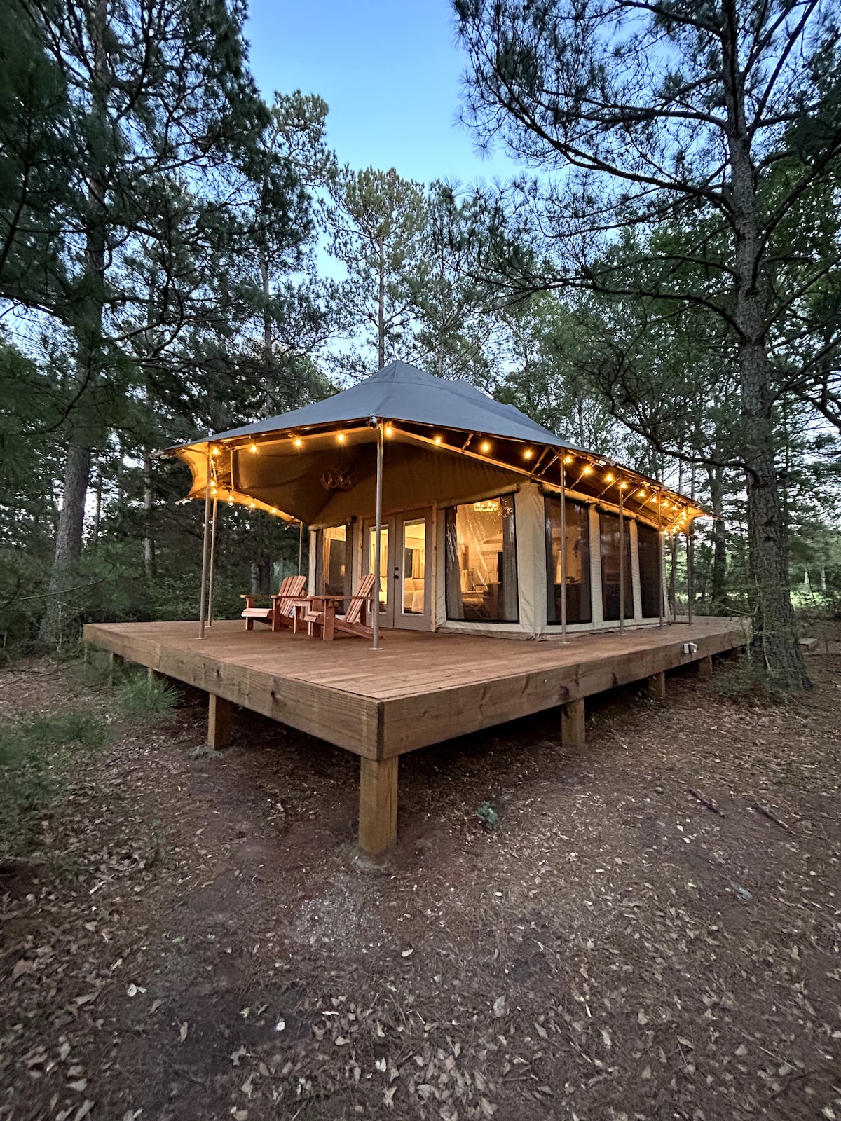Enjoy nature in a luxurious, climate controlled setting nestled in beautiful piney woods! Our safari tent is equipped with everything you need to relax and unwind. Take a bath in the claw foot tub, enjoy a book on the front porch, and sleep peacefully in the cozy king sized bed. Pinehaven will provide you an unforgettable glamping experience! Located approximately 20 minutes from Round Top, Texas.