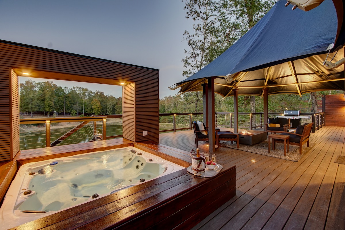 This 5 Star African Tent is in Hot Springs, Arkansas. Relax in a 7-person hot tub or use the heated outdoor shower on the deck. Inside the tent, enjoy your own TV viewing from bed. A stainless refrigerator with ice maker. Enjoy a wall oven and microwave drawer. Outdoor grill, wood burning pizza oven and fire pit. Private dock for fishing. Free Wi-Fi. The bathroom has a deep soaking tub with hand sprayer, and a heated bidet toilet. Come & experience The Covey of Hot Springs.