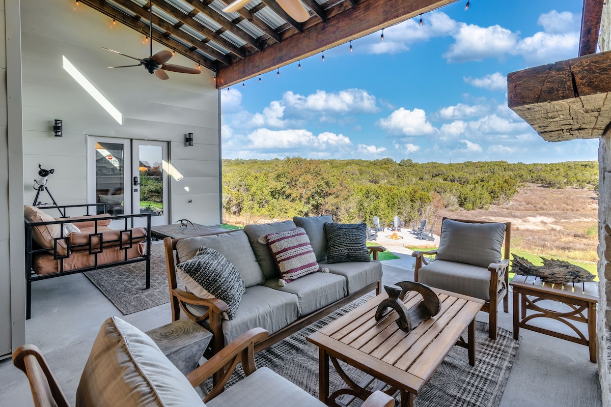 Beautiful “Hill Country Modern” home on five acres with a view of our seasonal pond and the valley. Our home incorporates the use of outdoor living space unlike any other. The patio and breezeway are integral parts of the usable space. One side of Sunrise House has a large living room with a fireplace and huge windows. The house has top-of-the-line fixtures and finishes, a mix of new and curated furniture and decor, and beautiful custom art.