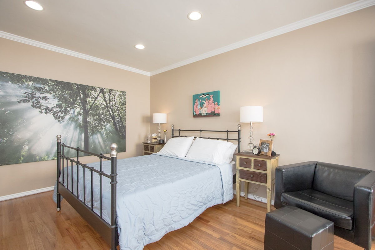 Private Suite in the beautifully winding roads of the Hollywood Hills; 5 min drive to Universal studios; 5 min walk to Runyon Canyon. Private Bathroom; Queen Bed; Disney+/HBO/Netflix/Amazon Prime. Free parking spot. The suite is deep-cleaned: interior surfaces, remotes, handles, linens cleaned at high temps - we all need a bit of peace of mind these days :) To increase value, I lowered the price to allow for LA’s Hotel Tax; High costs these days, and I wanted to help out wherever I could :)