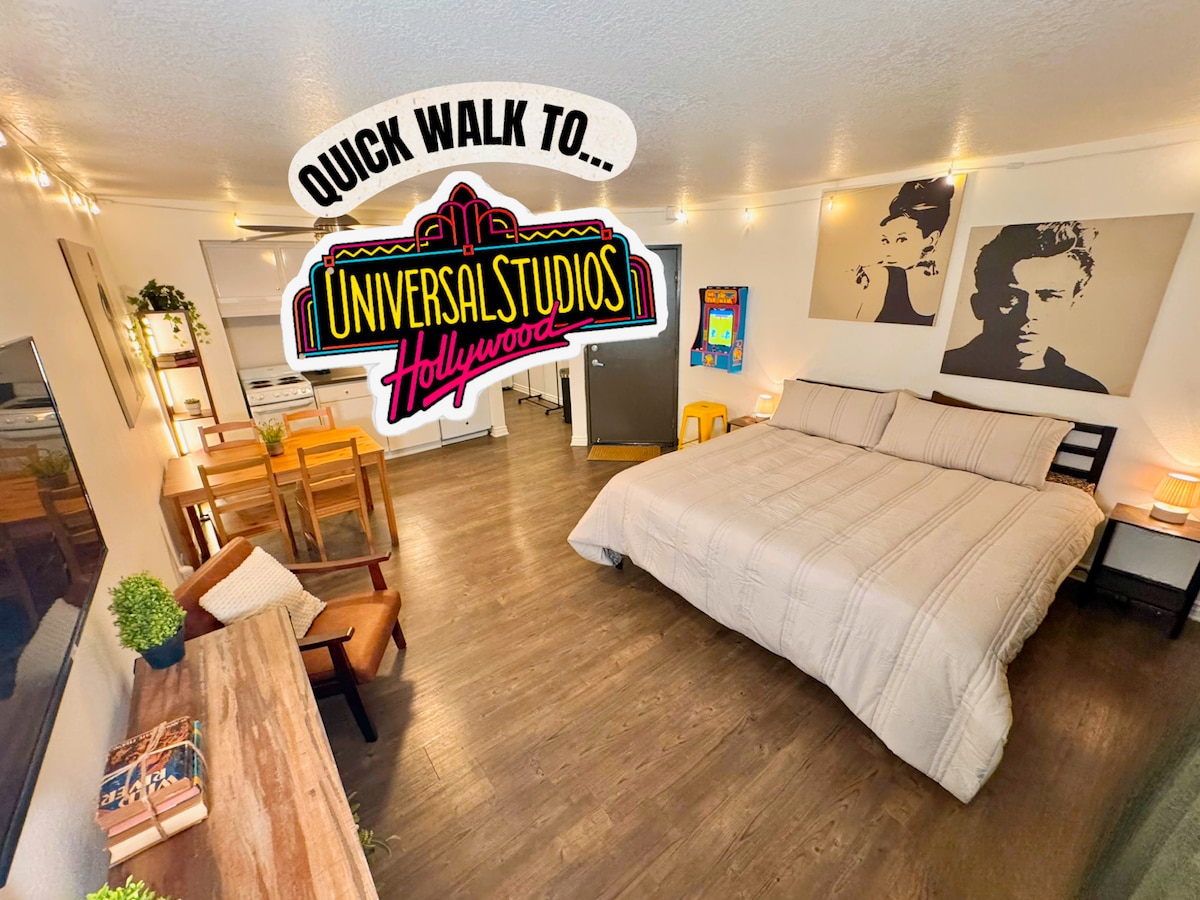 Enjoy a stylish experience at this centrally-located place! This is the bottom studio unit of a duplex just blocks from universal studios! There is parking space at the bottom of the driveway. Grass and backyard space available. There is a king bed and a pull out queen couch. Small kitchenette with snacks including a coffee machine. There is a refrigerator as well. No stovetop or oven. Small bathroom with small shower. Home-Sharing Registration Number is HSR23-000732