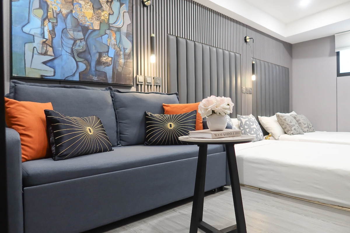 Our Premium Loft Plus has a unique layout that has a bedroom on an upper loft for added privacy. The high ceilings coupled with large windows create an airy and spacious feel in the apartment. Close proximity to landmarks such as CHIJMES, Suntec City, and Esplanade Food and grocery options are also only a stone’s throw away! Height clearance of the loft is 1.6m Apartment size: Approximately 190 sqft