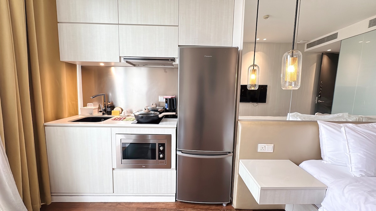 The ideal accommodation for business & leisure travelers looking for comfort & convenience. Lay back in your luscious yet functional room with a king-sized bed, well-equipped kitchenette and study/work desk. Furnished with stylish fittings, create a memorable and pleasurable stay in our Studio Apartment. 3 - 5 minutes walk to Bras Basah, Cityhall & Bugis MRT. Perfect for Work-From-Home with high speed Internet!