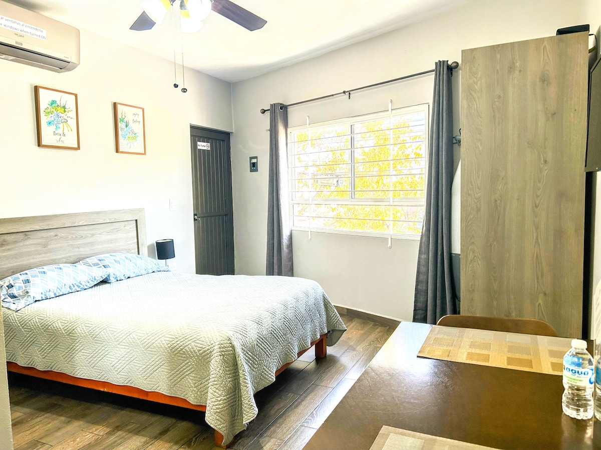 Enjoy the experience of staying in the heart of Monterrey. Light & comfortable studio-sized apartment with a queen bed, sofa bed, wifi, HD TV, bathroom and fully equipped kitchen with fridge and everything you need. Near the metro, train and important streets, you’ll be connected to the whole city within minutes.