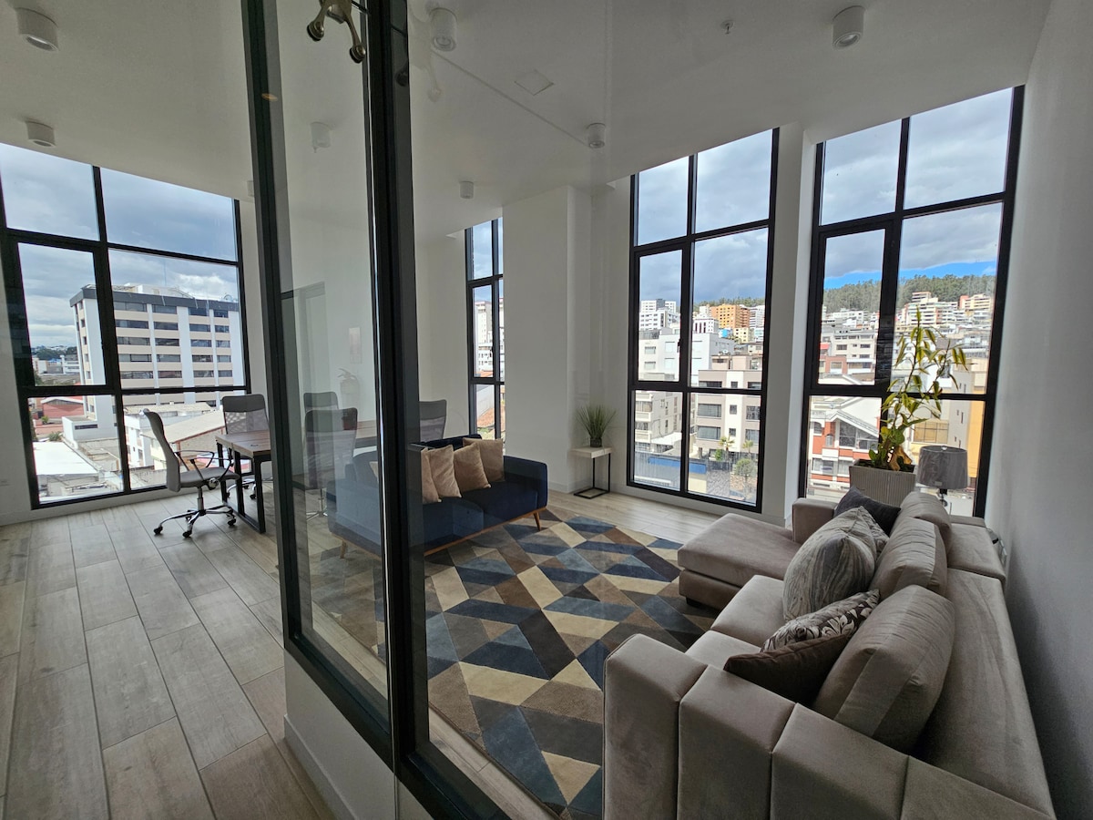 Moderno loft piso 21, edificio nuevo con generador de luz autónomo, ideal para viaje de negocios o para una ocasión especial, vista única de la ciudad. Ubicación privilegiada en el centro norte de Quito junto al parque La Carolina, además a tan solo unos pasos encontrarás centros comerciales e instituciones financieras. El servicio incluye parqueadero, wifi, cine en casa, tina de baño, agua caliente, lavadora/secadora comunal, elementos de higiene, gimnasio y piscina.