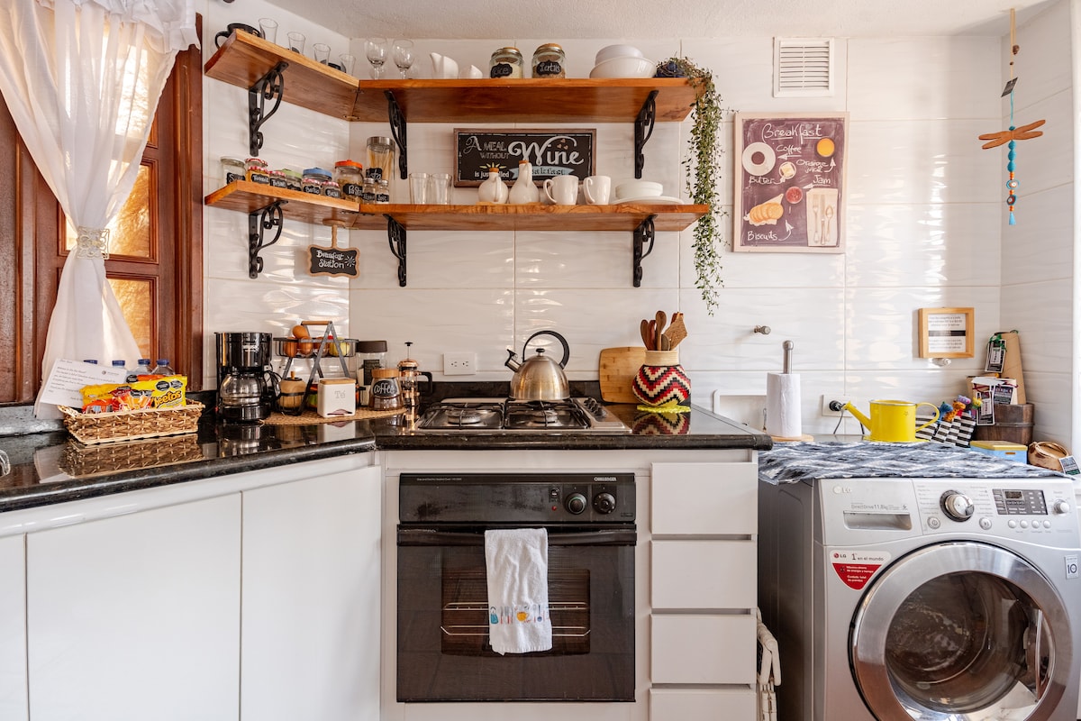 Hermoso apto en la calle mas linda del centro histórico. Romantico, autentico, acogedor, tiene mucha luz natural, temperatura agradable, hermosas vistas 360º a la ciudad y las montañas desde todos los espacios del apto. En el primer piso está la cocina abierta, sala, chimenea y balcón privado. Baño recién restaurado y habitacion con cama doble muy confortable y con ventana hacia la ciudad. Y para completar una linda experiencia, un altillo con vista al atardecer y hamaca para relajarse.