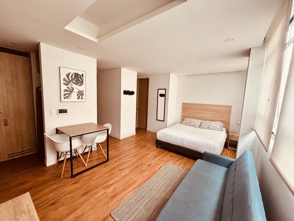 Moderno apartaestudio en La Candelaria con terraza y vistas a la ciudad y naturaleza. Ideal para trabajar en su zona de coworking y explorar los principales sitios turísticos de Bogotá: la Plaza de Bolívar, Catedral Primada, Museo del Oro y más. A minutos de universidades (Los Andes, Rosario, Externado). Disfruta de la peatonal Carrera Séptima y saborea la gastronomía en la Plaza de Mercado La Concordia. Perfecto para estancias cortas de turismo cultural o largos viajes de trabajo.