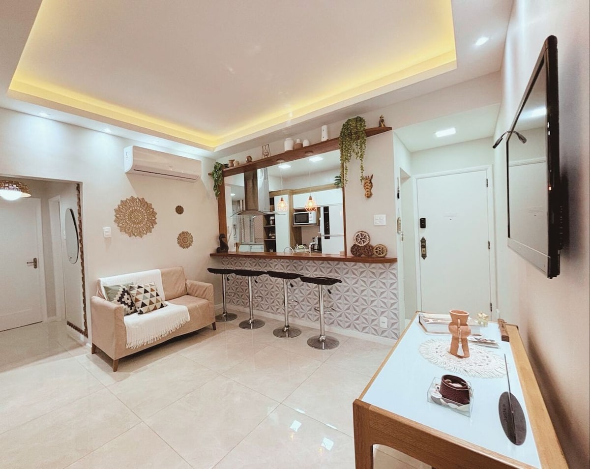 Este Flat tem 2 varandas e fica entre as 3 praias mais famosas do mundo, Posto 6 Copacabana, Arpoador e Ipanema! Um espaço elegante e moderno com garagem privativa, limpeza diária, portaria 24h a 50 metros da Praça General Osório a principal estação Metrô da Zona Sul e da popular Feira Hippie Carioca. Você ainda conta com muitas opções de compras, bares cheios de vida e restaurantes à porta! Aconchegante, feito para você se sentir em casa. todos são muito bem vindos em nossa casa.