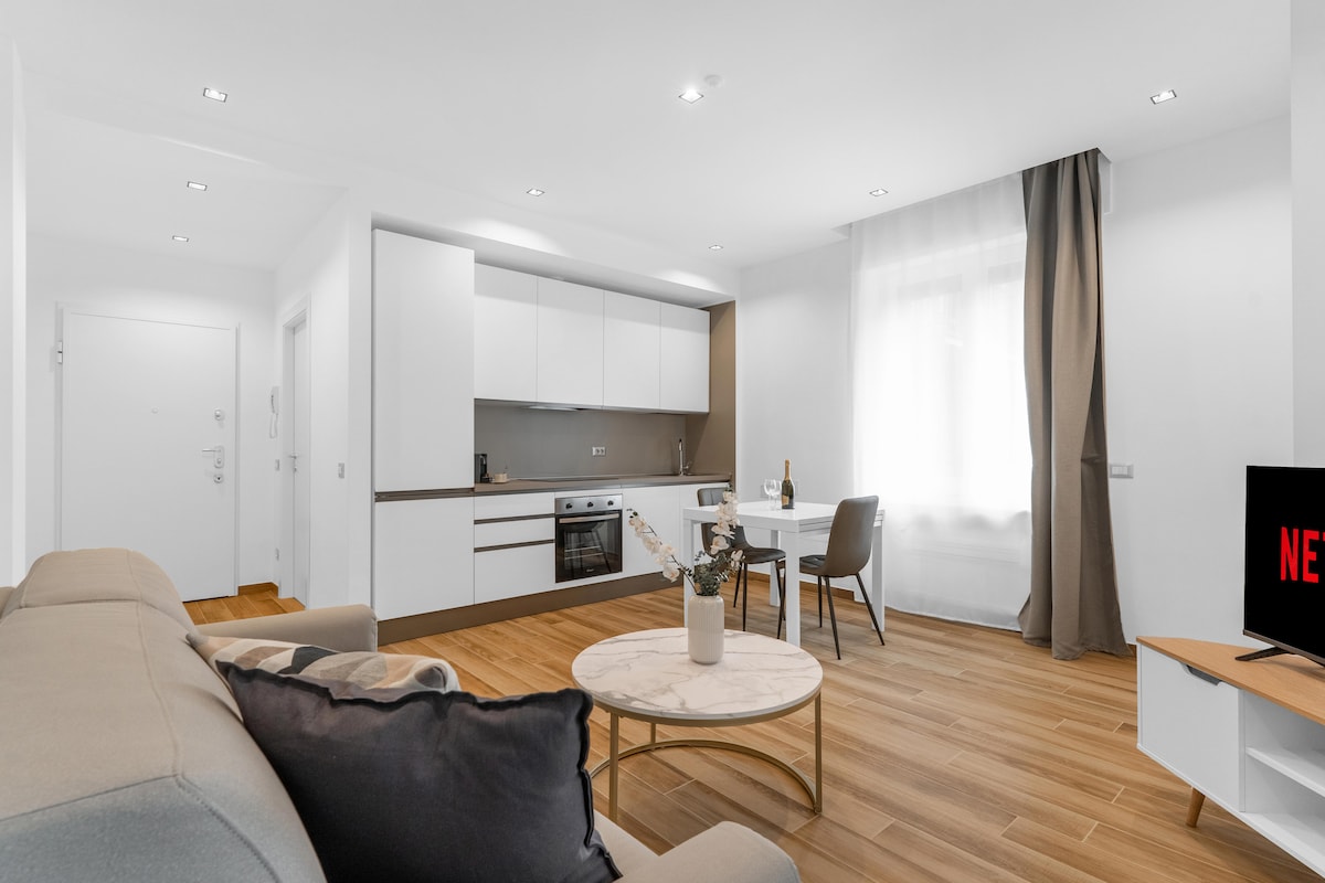 IN THE MOST IMPORTANT AREA OF MILAN in the heart of the center, a few steps from DUOMO Cathedral (2 minutes walk) and all the major points of interest. The apartment is located on the fourth floor, in an elegant and prestigious context. Luxurious suite furnished in a modern style with: luxury room with full kitchen and marble bathroom. Clean and comfortable. Building with lift. Air conditioning and Wi-Fi throughout the apartment.