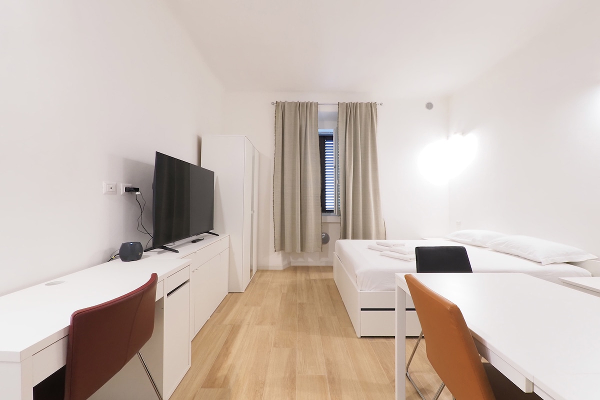 This one room apartment is split on two levels, with a cozy bedroom hosted in a wooden mezzanine, open on the living area. The kitchen area accommodates all the appliances, including a dishwasher, a washer/drier and a traditional oven. The bathroom, equipped with Italian ceramics and stainless steel fittings. Independent heating and air conditioning allow apartment temperature control in any season. A Smart TV with 32 inches screen and high speed fiber internet connection with Wi-Fi