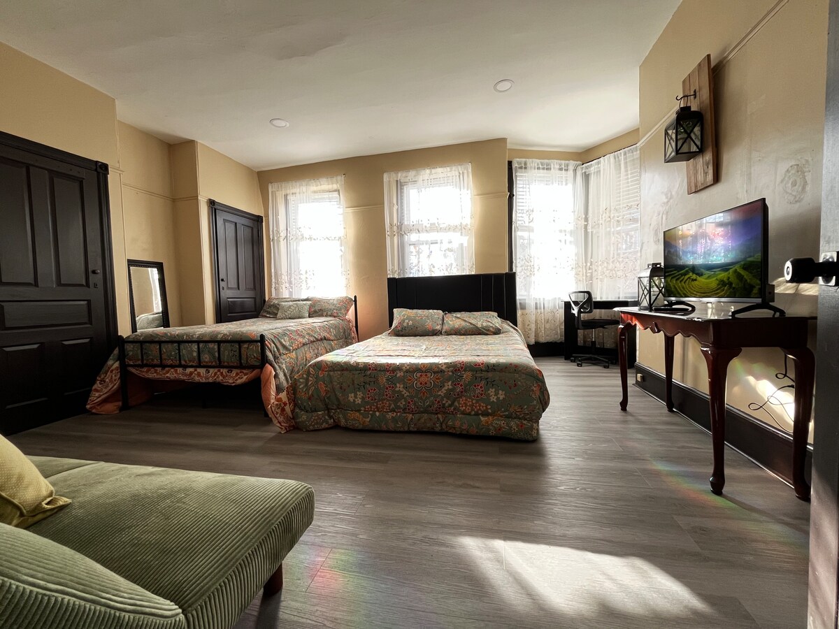 Welcome to The Emerald Room – A Luxe Urban Retreat A stylish 3-bedroom, 3-bathroom retreat with rich emerald, gold, and black accents throughout. Each bedroom features its own full bath for added privacy, while the open-concept living space and modern kitchen create the perfect setting to relax or entertain. Step outside to your private patio and unwind in comfort and style. A unique, elegant stay awaits. Perfectly suited for families, couples, or groups looking for a unique and elevated stay.
