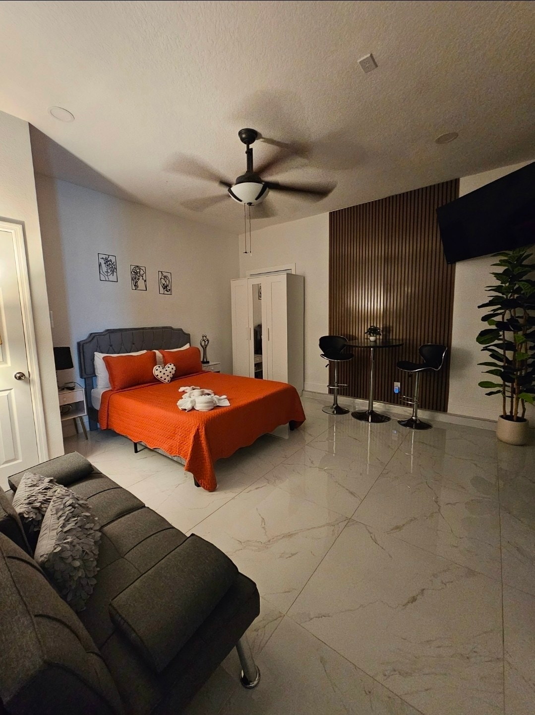 We offer BAG DROP! Amazing value studio 3.5 miles from USF and 7 miles from Busch Gardens. Private entrance. The only studio with TWO KING beds in the area. The sofa is memory foam and opens up to California King. Outdoor space and off street parking for two vehicles. Unlike other studios, this unit also has its own on demand hot water source and it's own HVAC allow you to control your own room temp. Pets welcome with approval. Don't miss this amazing value stay.