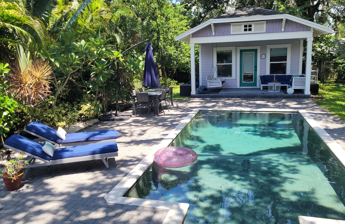 Experience Tampa from our little slice of Heaven right in the heart of Tampa Heights. This is a detached private Pool House in our backyard. At 264 sqft, It has a full Bath, Kitchen, and studio space with a Queen memory foam mattress, and work space / breakfast table. Enjoy the Pool and its tropical surroundings or just relax in a lounge chair. We are walking distance to Lee’s Pizza, Armature Works, River Walk, and much more... Included is a smart TV, WIFI, and Two Bicycles to go explore.